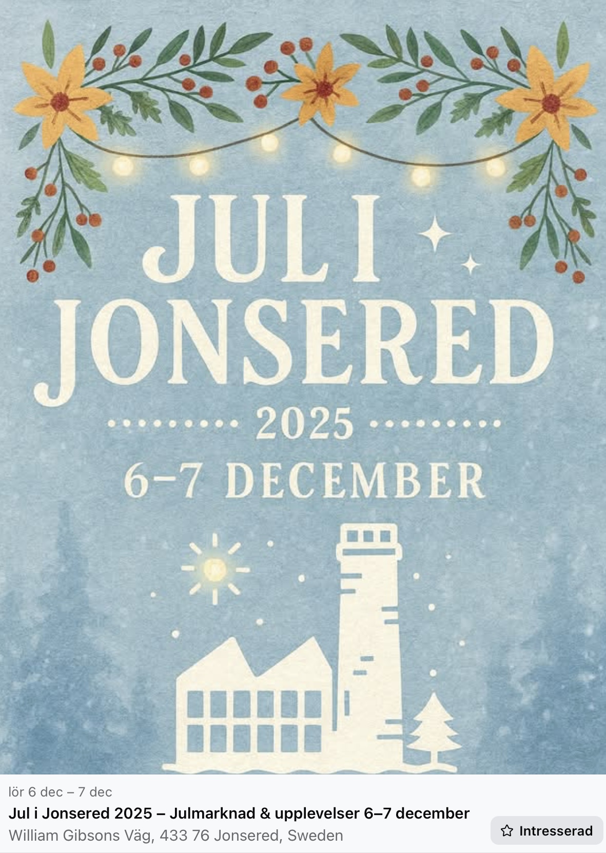 Lördagen den 6 december 10-16 är du välkommen till Jul i Jonsered i det gamla fabriksområdet i Jonsered.